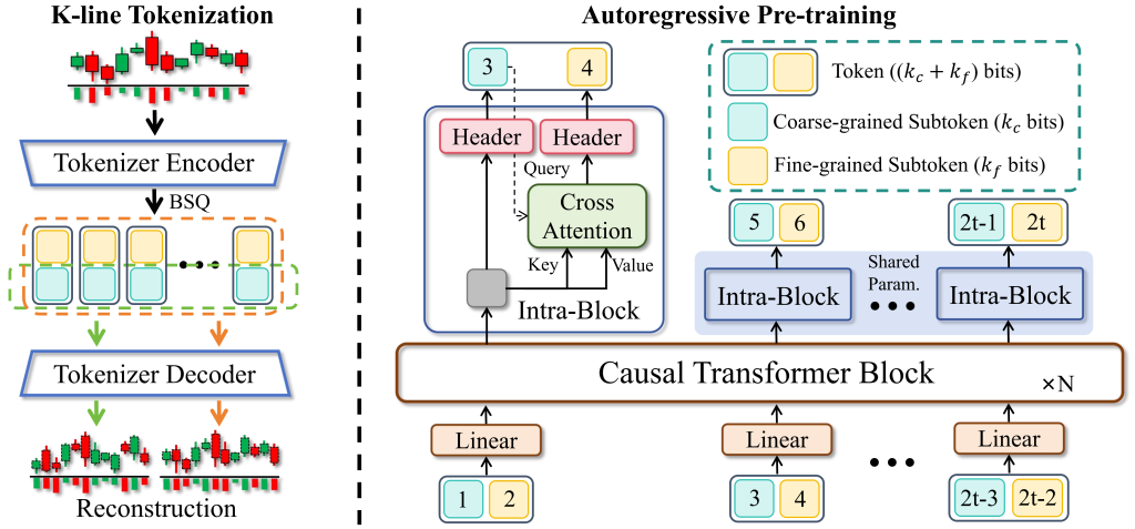 Once tokenized, a large autoregressive Transformer is pre-trained on these K-line sequences, learning the patterns and structures that repeat across markets, timeframes, and asset classes.