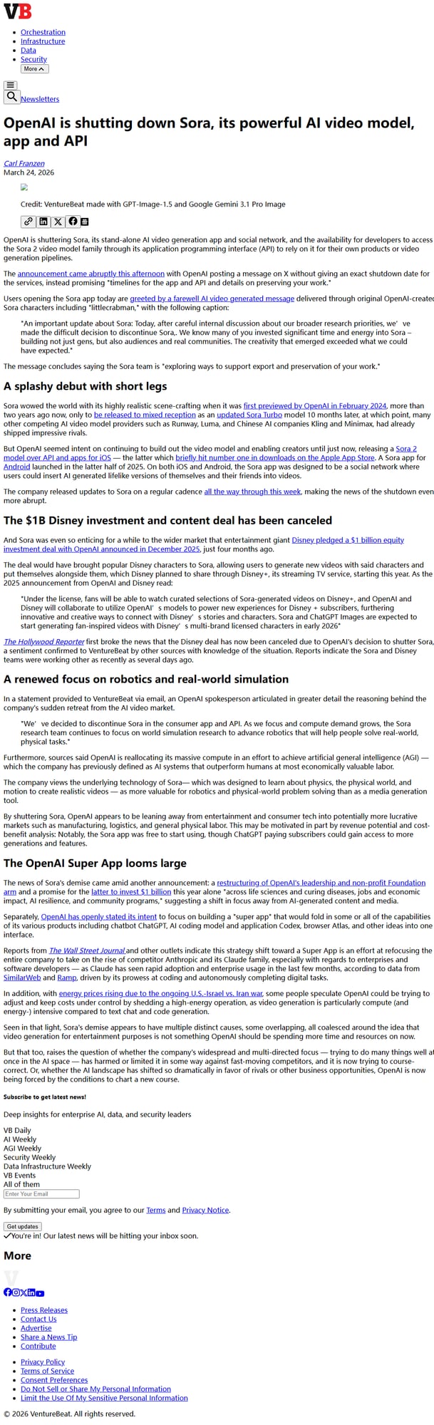 OpenAI has announced the shutdown of Sora, its AI video generation app and API, canceling a billion Disney deal and shifting focus to robotics and AGI research.